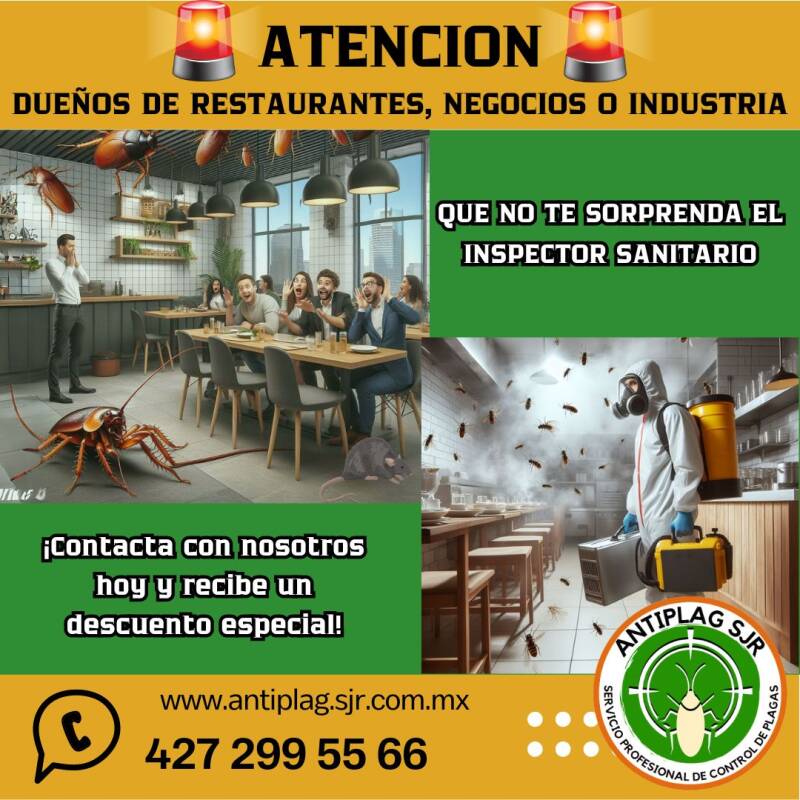 En Antiplag SJR, entendemos la importancia de mantener tu restaurante libre de plagas. Nuestros servicios de fumigación y control de plagas están diseñados para proteger tu negocio y garantizar la tranquilidad de tus clientes. ¡Contáctanos hoy mismo para mantener un ambiente seguro y saludable en tu establecimiento! 😊